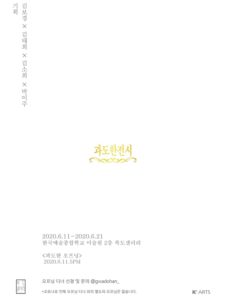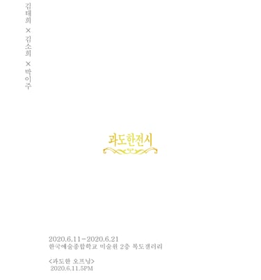 기획자들만이 모여 꾸리는《과도한전시》는 학교의 복도라는 통로 공간을 ‘갤러리’로 활용하는 특수성에서 비롯되는 한계에 대한 인식에서 출발해, 은유의 방식을 통해 전시 또는 미술계를 이루는 조건에 관해 이야기하고자 한다. 이는 ‘복도갤러리’라는 포맷 안에서 개별 전시가 공간 자체에 대한 관찰 없이 관례화되는 상황과 함께 동시대 미술 전시에서 비판적 성찰 없이 반복되는 요소들에 대한 언급이기도 하다. 본 전시는 필요하지만 필요하지 않은, 혹은 필요해 보이지 않으나 어쩌면 필수적일지도 모르는 억제된 조건들을 극단적으로 확장한다. 이러한 과장은 오히려 그것과 더불어 유희하고자 하는 것으로 전시는 과도해지기를 자처하며, 스스로 엔터테인먼트가 된다.