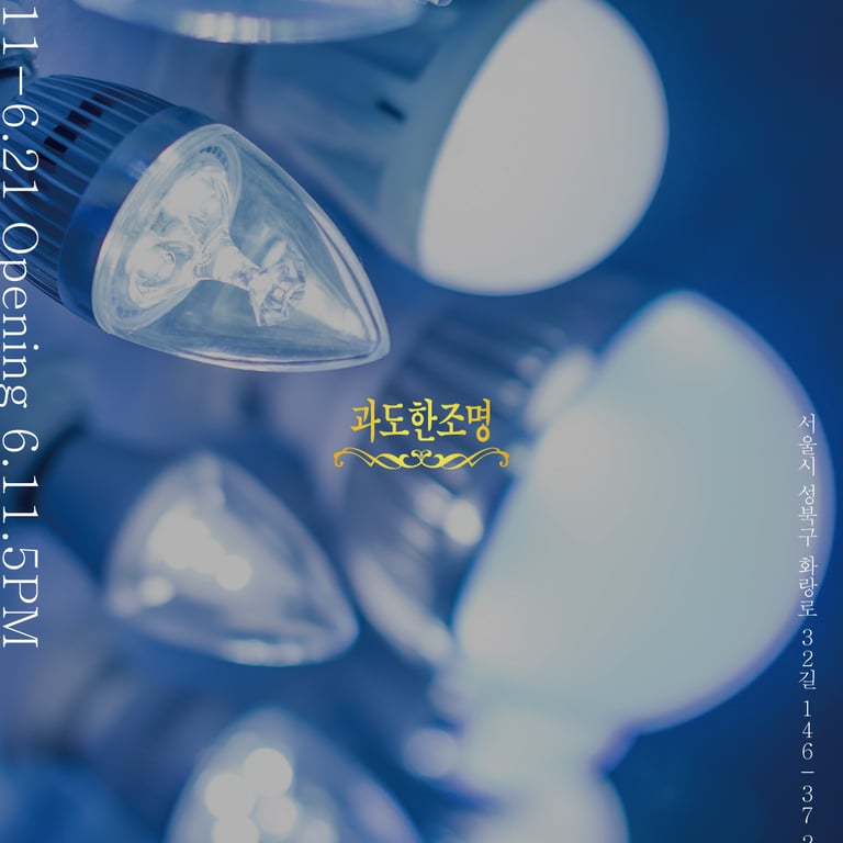3부로 구성된 본전시에서 시·공간적 차를 두고 설치되는 <과도한조명>, <과도한오프닝>, <과도한식물> 은 모두 이러한 조건에 대한 은유이다. <과도한조명>은 통로의 일정 구간 양 벽면에 촘촘하게 달린 백색 조명으로 이루어져 맞은편 서로의 텅 빈 벽면을 강한 조도로 비춘다. 전시 기간 내내 설치되는 <과도한조명>을 배경으로 삼아 일시적인 이벤트 <과도한오프닝>이 행해진다. 이때 오프닝의 다과는 샐러드부터 시작해 디저트까지 포함하는 코스 요리의 형태로 서빙되며, 길어진 식사 시간으로 말미암아 일종의 퍼포먼스가 된다. 마지막으로, 전시 중반 설치되는 화환에 대한 언급인 <과도한식물>은 시각적으로 아름다우면서도, 생물임에도 불구하고 마치 조각 혹은 설치와 같은 느낌을 주는 기이한 분위기 를 연출한다.