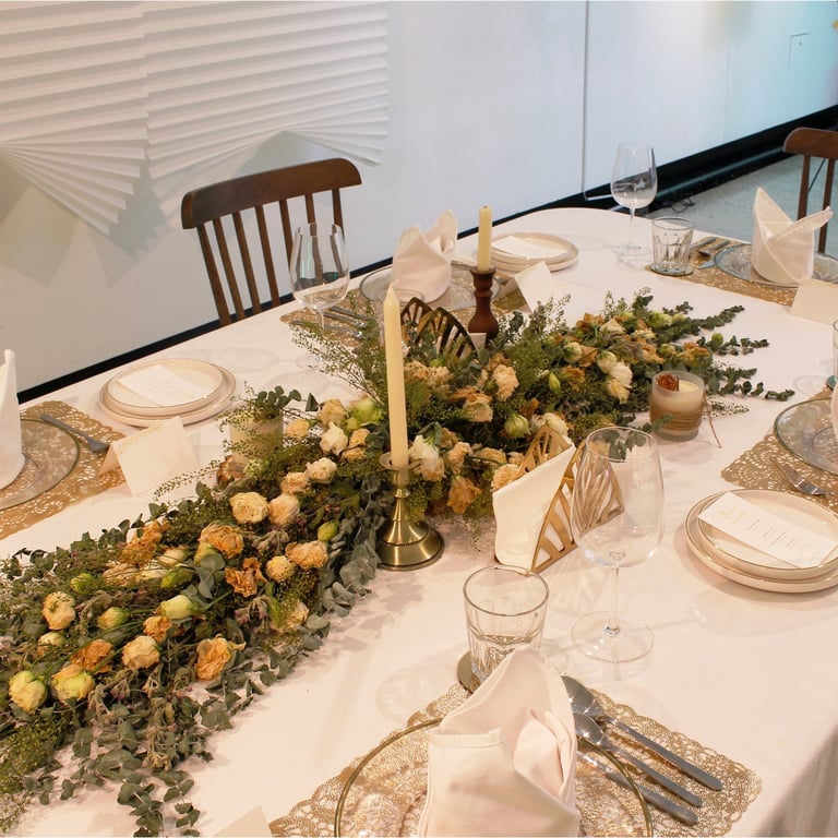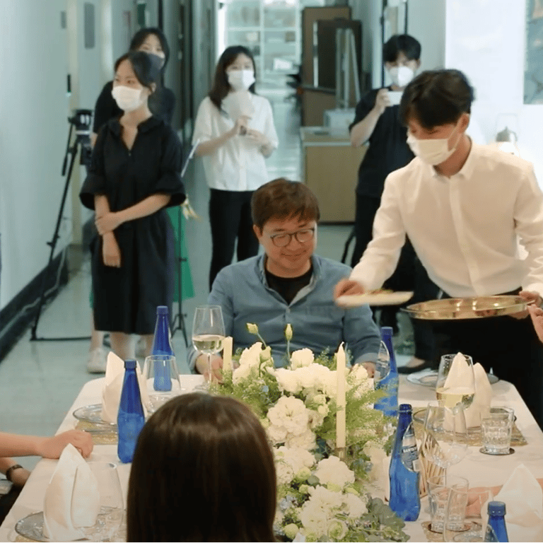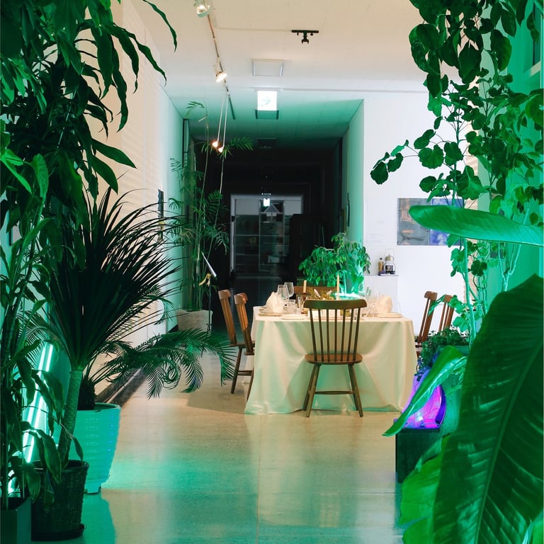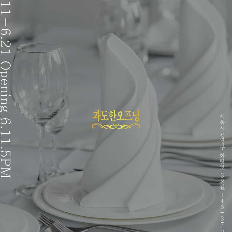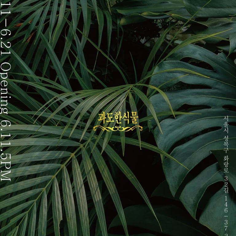 This exhibition is divided into three parts. <Excessive Lighting>, <Excessive Opening>, and <Excessive Plants>, installed with a spatial and temporal gap, are all metaphors for these conditions. <Excessive Lighting> consists of densely spaced white lights on certain sections of the corridor walls, illuminating the empty walls on the opposite side with strong intensity. The <Excessive Opening>, held as a temporary event against the backdrop of the <Excessive Lighting> installed throughout the exhibition period, serves a course meal format ranging from salads to desserts and becomes a kind of performance due to the extended mealtime. Finally, <Excessive Plants>, mentioned during the mid-exhibition installation of floral arrangements, creates a visually stunning yet somewhat eerie atmosphere, resembling sculptures or installations despite being living organisms.