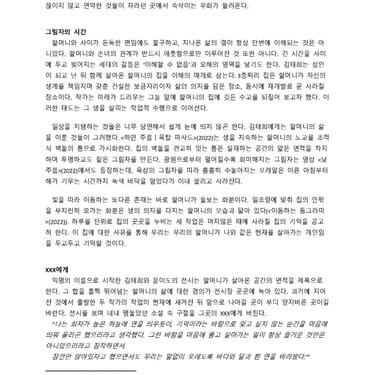 The exhibition "231.4+131.82" began from the personal and intimate experiences and memories of the artists, but it serves to remind us that it could also become a story about our grandmothers and eventually about ourselves. This attitude is soon evident, aiming not to designate specific subjects but to pursue anonymity and to show the true appearance without trying to describe poignant personal stories. The effort of the artists who resided in the houses but strived to 'designate anonymity,' indicated in the title, and the efforts of the artists to depict the mosaics of spaces that constituted the areas are considered attempts not to portray the lives of grandmothers who lived through the tumultuous modern era solely through sentimentalism. By recording the women who lived in different eras in their own ways, using toothpicks and grains of sand, they confirm the value worth remembering for us.