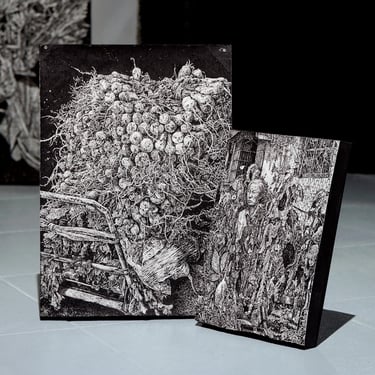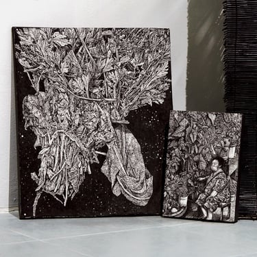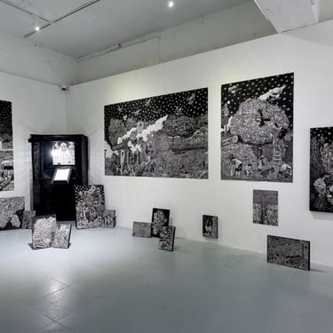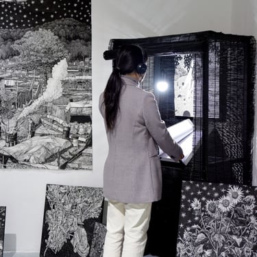 Yun Yi-doe draws images on a canvas using a toothpick instead of a brush, dabbing ink onto the toothpick tip. Regardless of the area, ranging from the size of an A4 sheet of paper to that of a child's height, Yoon fills the canvas resolutely. The landscapes depicted by the artist, which cannot be fully conveyed even with words of hardship, are derived from a process experienced by the artist directly or indirectly during the six months spent sorting through the mementos of the grandmother who suddenly passed away a few years ago. While the landscapes embroidered on the canvas may have seemed like mere glimpses to the artist's eyes at first, considering that it represents the scenery of the village where the grandmother regarded as her second hometown lived for over 50 years, it can hardly be regarded as just one person's perspective. The gaze that cannot clearly distinguish whether it belongs to the grandmother, the artist, or someone else in the village manifests as a meticulous reproduction that reconstructs time and space, traversing inside and outside the house and wandering through various places in the village.