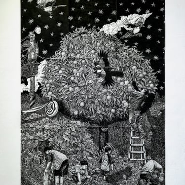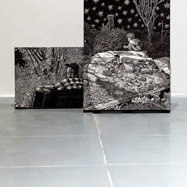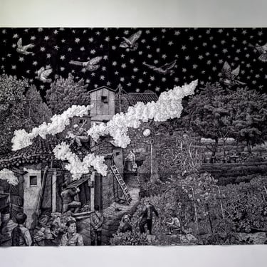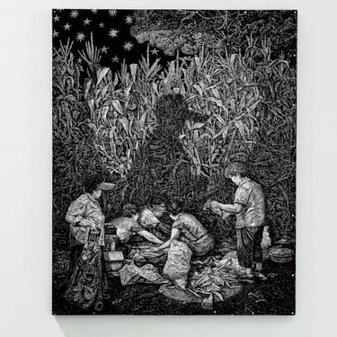 윤이도는 붓 대신 이쑤시개 끝에다 먹을 적셔서 장지에 이미지를 그려낸다. A4 용지 만한 크기에서 부터 어린아이 키를 훌쩍 넘기는 크기의 종이까지, 면적에 상관없이 우직하게 화면을 채워나간다. 수고스럽다는 말로도 다 담을 수 없을 만큼 지난한 과정을 거쳐 작가가 담아내는 풍경은 몇 년 전, 갑작스레 세상을 떠난 할머니의 유품을 정리하는 반년여의 시간 동안 작가가 직·간접적으로 경험한 것에서 기인한다. 장지에 수 놓인 풍경은 언뜻 작가의 눈에 담겼을 모습이었을 것으로 여겨졌다가도, 할머니가 50여 년을 제2의 고향이라 여기며 지냈던 마을의 풍경임을 감안하면 단지 한 사람의 시점이라 여길 수만은 없을 것이다. 할머니의 것인지, 작가의 것인지, 마을 구성원 누군가의 것인지 명확하게 구분할 수 없는 시선은 집 안팎, 마을 공터 여기저기를 넘나들며 시공간을 재구성하고 손끝으로 더듬어질 만큼 정치(精緻)한 재현으로 나타난다. 수십 년을 매일 같이 마을 사람들과 함께 갈고 닦았던 할머니의 터전은 이제 도시 개발 사업으로 누군가의 기억 속에서만 존재하게 되었다. 하염없이 흘러가는 시간과 기억을 담아내려는 작가의 노력은 이쑤시개 끝에서 이루어지며 하나같이 어두운 밤을 묘사하는데, 희망이라 읽고 싶은 별빛만이 하늘 가득 차 있다.