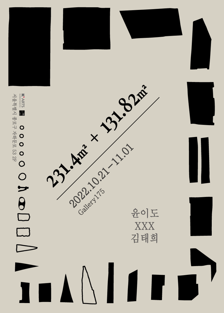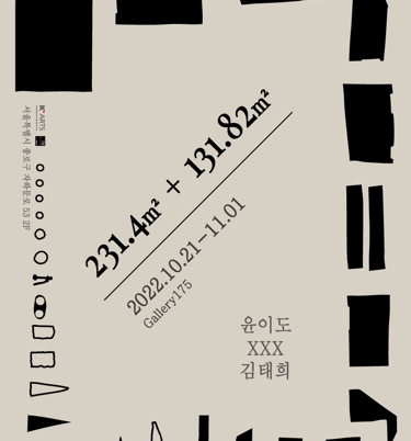 종로구 통인동에 위치한 갤러리175에서의 이번 전시 『231.4㎡+131.82㎡』 (이하 이삼일더하기일삼일)는 생명의 근원으로 막연히 사랑한다 여겼지만 사실은 이해하기 어려웠던 대상을 조용히 오랜 시간 끈질기게 마주하고 들여다본 여정의 결과물을 보여준다. 전시를 구성한 주체이자 작가인 윤이도, 김태희는 익명의 누군가를 호명할 때 사용하는 지칭 명사 'XXX(엑스엑스엑스)'라는 팀명 아래 이번 전시를 기획했다. 231.4㎡와 131.82㎡는 각각 작가의 할머니들이 점유하던 주거 공간의 면적을 의미하는 한편, 전시를 홍보하기 위한 이미지에 쓰인 길쭉한 삼각형, 비스듬한 사각형, 비뚤배뚤한 다각형 등의 디자인 요소들은 두 작가의 할머니 집 도면에 등장하는 크고 작은 공간을 나타낸다.